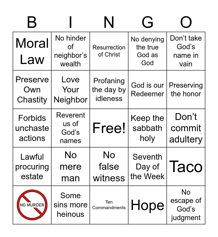 This bingo card has 2 images, a free space and 54 words: Obedience, Moral Law, Ten Commandments, Love God, Love Your Neighbor, God Freed You, God is our Redeemer, Acknowledge God to be the only true God, No denying the true God as God, God displeased with idol worship, No Graven Images, Keeping pure religious worship, No worship of God by images, God’s sovereignty over us, Don’t take God’s name in vain, Reverent us of God’s names, No profaning God’s names, No escape of God’s judgment, Keep the sabbath holy, One whole day in seven, Seventh Day of the Week, Resurrection of Christ, Holy resting all day, Profaning the day by idleness, God blessed the Sabbath day, Honor Your Parents, Preserving the honor, Neglecting the honor and duty, Promise of Long Life, No Murder, Preserve own life, No Murdering Neighbor, Don’t commit adultery, Preserve Own Chastity, Forbids unchaste actions, No stealing, Lawful procuring estate, No hinder of neighbor’s wealth, No false witness, Forbids injuring neighbor’s reputation, No coveting, Full Contentment, Forbids all discontentment, No mere man, Some sins more heinous, God’s wrath and curse, Andrew, Levy, Hope, Faith, Ruth, Regeneration, Taco and Love.