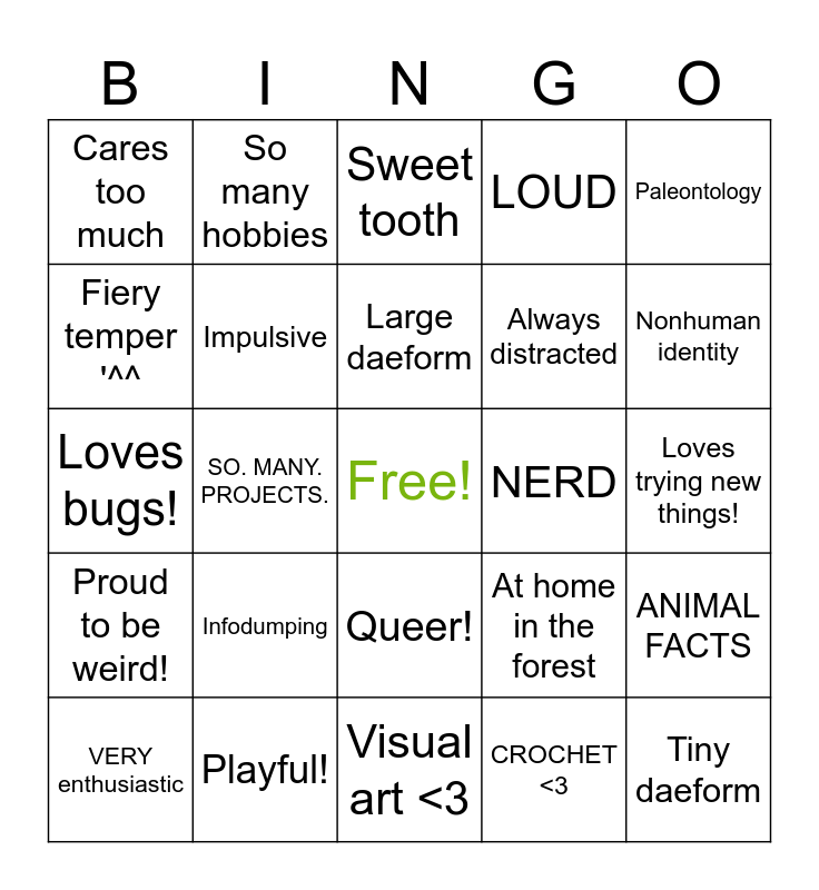 This bingo card has a free space and 24 words: Infodumping, Playful!, Large daeform, VERY enthusiastic, Paleontology, Cares too much, Fiery temper '^^, So many hobbies, NERD, Queer!, Always distracted, Loves bugs!, At home in the forest, ANIMAL FACTS, Impulsive, CROCHET <3, Loves trying new things!, Sweet tooth, Nonhuman identity, SO. MANY. PROJECTS., Tiny daeform, Proud to be weird!, LOUD and Visual art <3.