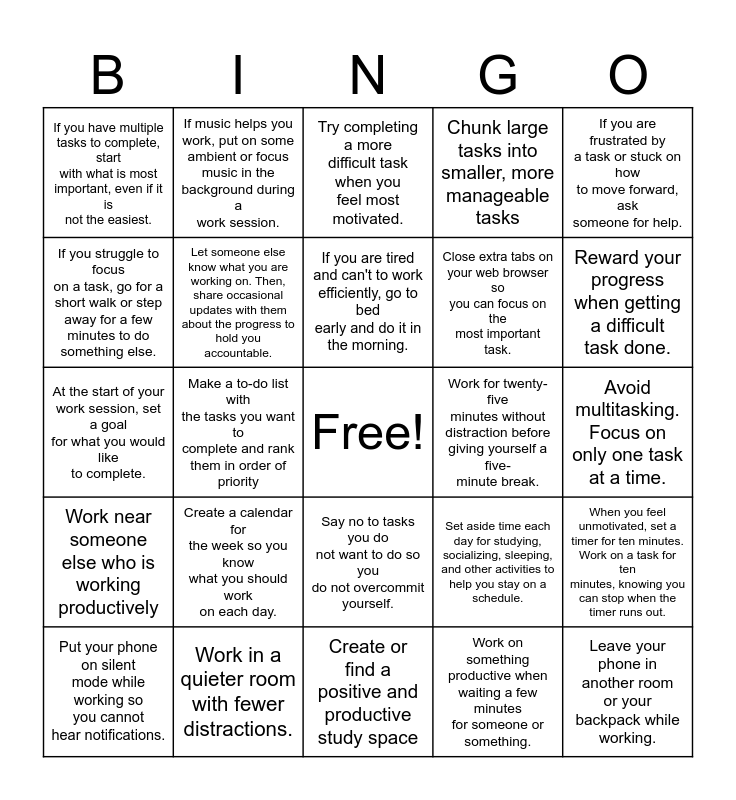 This bingo card has a free space and 24 words: Create a calendar for the week so you know what you should work on each day., Work in a quieter room with fewer distractions., If you are tired and can't to work efficiently, go to bed early and do it in the morning., Put your phone on silent mode while working so you cannot hear notifications., If you are frustrated by a task or stuck on how to move forward, ask someone for help., If you have multiple tasks to complete, start with what is most important, even if it is not the easiest., If you struggle to focus on a task, go for a short walk or step away for a few minutes to do something else., If music helps you work, put on some ambient or focus music in the background during a work session., Work for twenty-five minutes without distraction before giving yourself a five- minute break., Say no to tasks you do not want to do so you do not overcommit yourself., Close extra tabs on your web browser so you can focus on the most important task., At the start of your work session, set a goal for what you would like to complete., Set aside time each day for studying, socializing, sleeping, and other activities to help you stay on a schedule., When you feel unmotivated, set a timer for ten minutes. Work on a task for ten minutes, knowing you can stop when the timer runs out., Let someone else know what you are working on. Then, share occasional updates with them about the progress to hold you accountable., Work on something productive when waiting a few minutes for someone or something., Avoid multitasking. Focus on only one task at a time., Try completing a more difficult task when you feel most motivated., Reward your progress when getting a difficult task done., Make a to-do list with the tasks you want to complete and rank them in order of priority, Leave your phone in another room or your backpack while working., Work near someone else who is working productively, Chunk large tasks into smaller, more manageable tasks and Create or find a positive and productive study space.