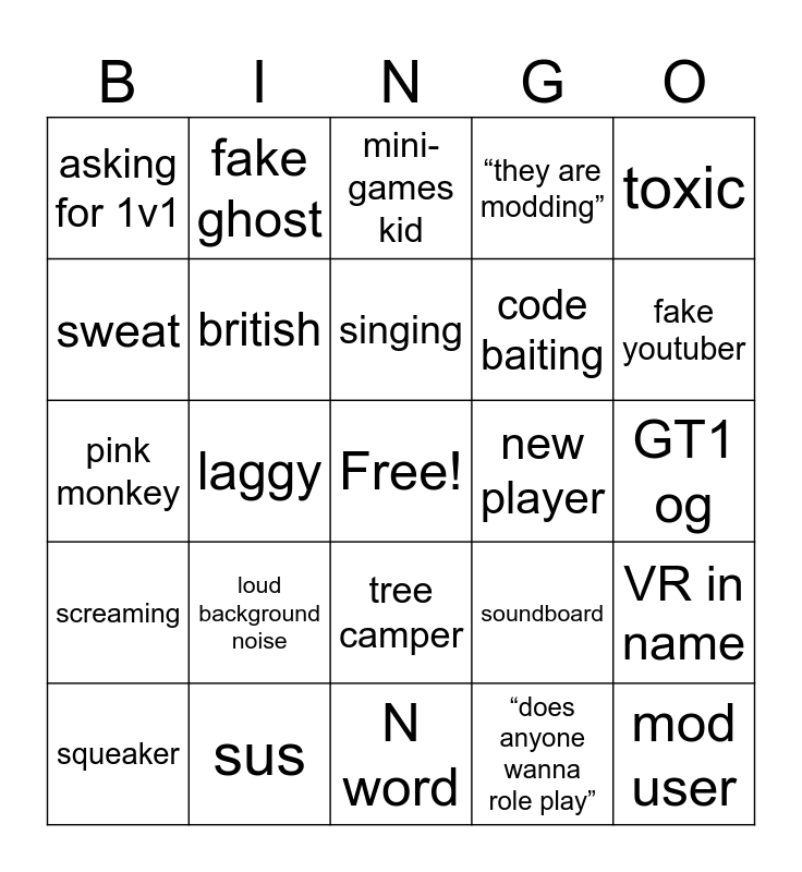 This bingo card has a free space and 24 words: squeaker, loud background noise, singing, “does anyone wanna role play”, toxic, asking for 1v1, fake ghost, mini-games kid, new player, GT1 og, pink monkey, british, soundboard, VR in name, sweat, sus, N word, “they are modding”, fake youtuber, screaming, laggy, tree camper, code baiting and mod user.