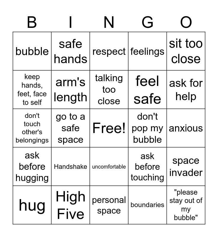 This bingo card has a free space and 24 words: Handshake, High Five, talking too close, hug, sit too close, bubble, keep hands, feet, face to self, safe hands, don't pop my bubble, uncomfortable, feel safe, don't touch other's belongings, ask before touching, space invader, arm's length, boundaries, anxious, respect, ask for help, go to a safe space, "please stay out of my bubble", ask before hugging, feelings and personal space.