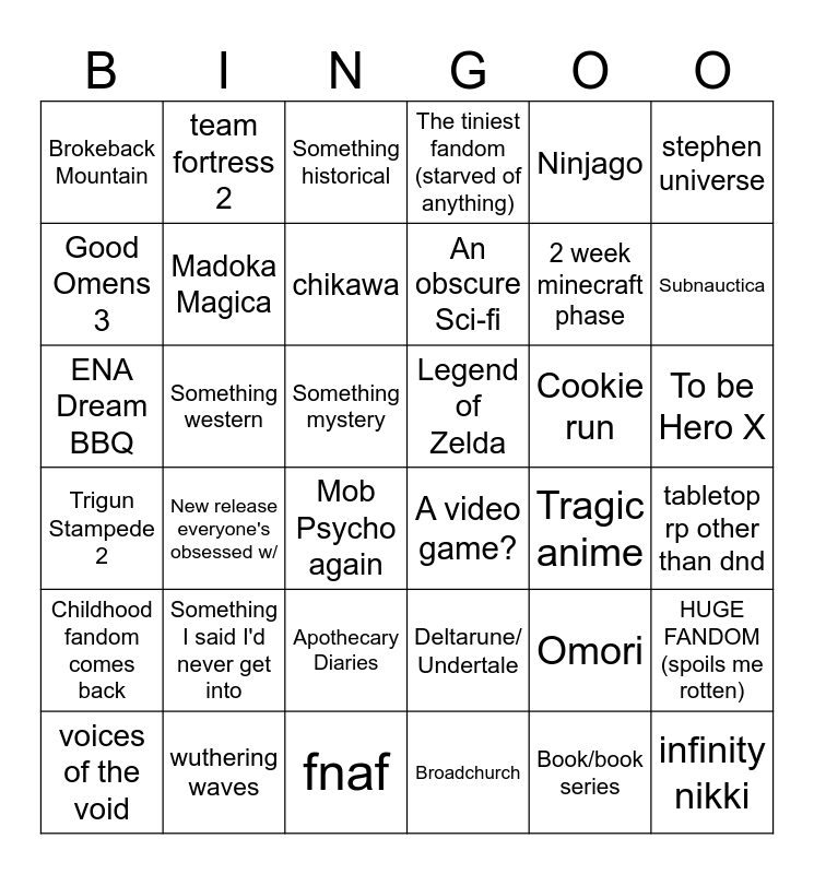This bingo card has 36 words: Deltarune/ Undertale, Apothecary Diaries, Broadchurch, Good Omens 3, Trigun Stampede 2, Legend of Zelda, Madoka Magica, fnaf, Ninjago, Omori, Subnauctica, The tiniest fandom (starved of anything), HUGE FANDOM (spoils me rotten), Something western, An obscure Sci-fi, Brokeback Mountain, Childhood fandom comes back, Cookie run, ENA Dream BBQ, Something historical, Something mystery, New release everyone's obsessed w/, A video game?, Mob Psycho again, Tragic anime, team fortress 2, 2 week minecraft phase, wuthering waves, chikawa, stephen universe, infinity nikki, voices of the void, tabletop rp other than dnd, To be Hero X, Something I said I'd never get into and Book/book series.