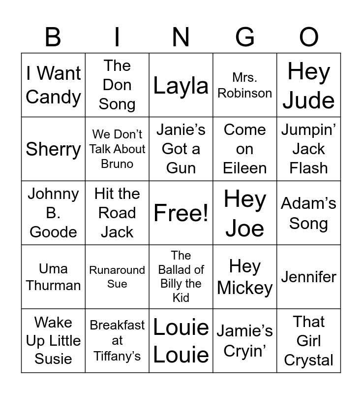 This bingo card has a free space and 100 words: 867-5309 / Jenny, A Boy Named Sue, Adam’s Song, Alejandro, Amanda, Amy, Annie’s Song, Bad, Bad Leroy Brown, Barbara Ann, Bennie and the Jets, Beth, Billie Jean, Brandy (You’re a Fine Girl), Breakfast at Tiffany’s, Breña, Buddy Holly, Come on Eileen, Crystal, Danny’s Song, Darling Nikki, Dirty Diana, Fancy, Georgia on My Mind, Good Golly Miss Molly, Goodnight Elisabeth, Hey Joe, Hey Jude, Hey Mickey, Hey Stephen, Hey There Delilah, Hit the Road Jack, I Want Candy, Iris, Jack & Diane, Jamie’s Cryin’, Janie’s Got a Gun, Jennifer, Jenny From the Block, Jeremy, Jessica, Jessie’s Girl, Joanna, Johnny B. Goode, Jolene, Jumpin’ Jack Flash, Layla, Lola, Long Tall Sally, Lorelei, Louie Louie, Lucy In the Sky With Diamonds, Maggie May, Major Tom, Mandy, Maria, Maria, Mary Jane, Mary Jane’s Last Dance, Me and Bobby McGee, Movin’ Out (Anthony’s Song), Mrs. Robinson, Mustang Sally, My Name is Not Susan, Natalie, Nicole, Olivia, Peggy Sue, Proud Mary, Renee, Romeo and Juliet, Rosanna, Roxanne, Runaround Sue, Sandy, Sara’s Smile, Sarah’s Place, Scotty Doesn’t Know, Sheena Was a Punk Rocker, Sherry, Stacy’s Mom, Stephanie, Sweet Caroline, That Girl Crystal, The Anthony Song, The Ballad of Billy the Kid, The Crystal Song, The Don Song, Tim McGraw, Tom Sawyer, Tommy the Cat, Uma Thurman, Uncle Albert / Admiral Halsey, Uncle John’s Band, Valerie, Wake Up Little Susie, We Don’t Talk About Bruno, Wendy, What’s the Frequency, Kenneth?, Who’s David, Whole Lotta Rosie and Daniel.
