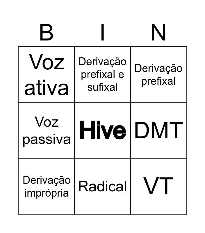 This bingo card has a free space and 17 words: Modo subjuntivo, Justaposição, Derivação prefixal, Voz ativa, Palavra primitiva, Voz passiva, Derivação Sufixal, Derivação imprópria, Radical, DMT, DNP, Voz reflexiva, VT, Derivação prefixal e sufixal, Derivação regressiva, Derivação parassintética and Aglutinação.