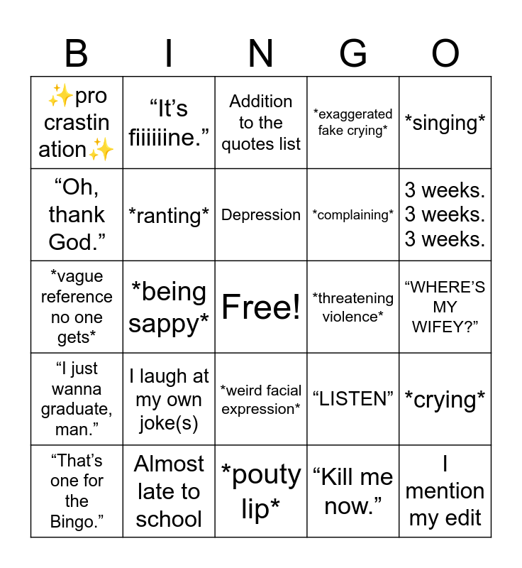 This bingo card has a free space and 24 words: I laugh at my own joke(s), Almost late to school, Depression, “That’s one for the Bingo.”, *singing*, ✨pro crastin ation✨, “Oh, thank God.”, “It’s fiiiiiine.”, *threatening violence*, *weird facial expression*, *complaining*, *vague reference no one gets*, “LISTEN”, *crying*, *ranting*, “Kill me now.”, “WHERE’S MY WIFEY?”, Addition to the quotes list, 3 weeks. 3 weeks. 3 weeks., *being sappy*, I mention my edit, “I just wanna graduate, man.”, *exaggerated fake crying* and *pouty lip*.