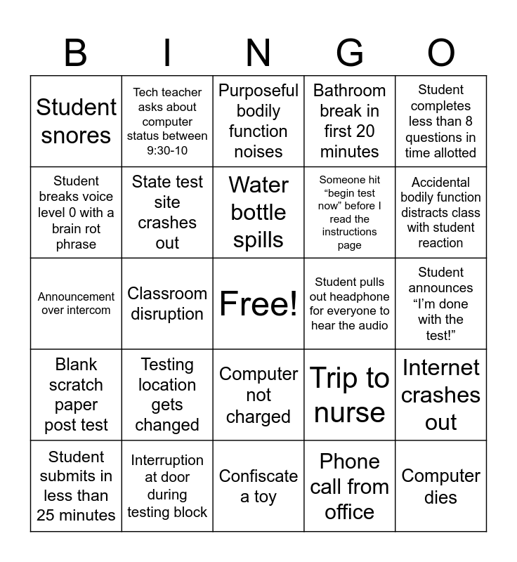 This bingo card has a free space and 24 words: Testing location gets changed, Interruption at door during testing block, Water bottle spills, Student submits in less than 25 minutes, Student completes less than 8 questions in time allotted, Student snores, Student breaks voice level 0 with a brain rot phrase, Tech teacher asks about computer status between 9:30-10, Student pulls out headphone for everyone to hear the audio, Computer not charged, Someone hit “begin test now” before I read the instructions page, Announcement over intercom, Trip to nurse, Internet crashes out, State test site crashes out, Phone call from office, Student announces “I’m done with the test!”, Purposeful bodily function noises, Accidental bodily function distracts class with student reaction, Classroom disruption, Computer dies, Blank scratch paper post test, Bathroom break in first 20 minutes and Confiscate a toy.