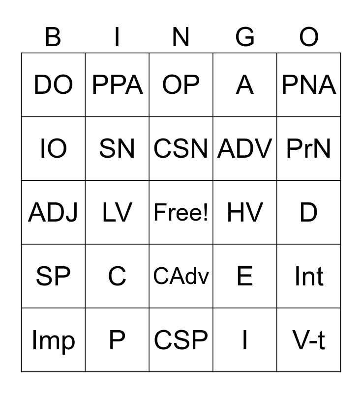 This bingo card has a free space and 24 words: C, P, CSN, Imp, PNA, DO, IO, PPA, HV, CAdv, ADV, ADJ, E, Int, SN, I, D, OP, PrN, LV, V-t, SP, A and CSP.