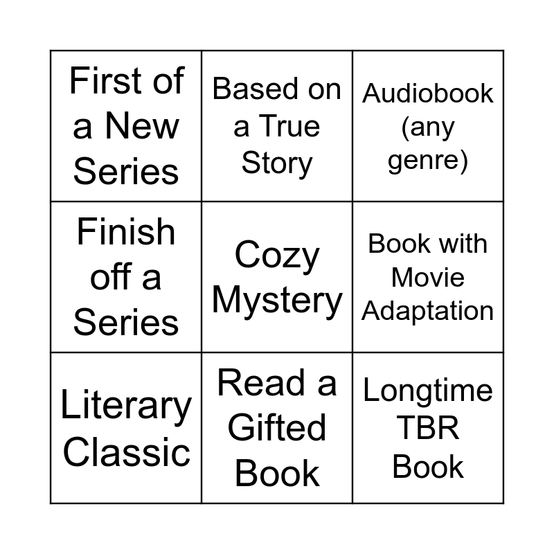 This bingo card has a free space and 8 words: Book with Movie Adaptation, Audiobook (any genre), Based on a True Story, Literary Classic, First of a New Series, Longtime TBR Book, Finish off a Series and Read a Gifted Book.