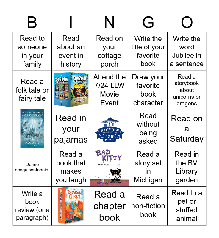 This bingo card has 6 images, a free space and 35 words: Attend the 7/24 LLW Movie Event, Participate in a LWW event, Write the word Jubilee in a sentence, Define sesquicentennial, Read in your pajamas, Write the title of your favorite book, Read to a pet or stuffed animal, Read on a Saturday, Read without being asked, Read a book that makes you laugh, Attend a BV Library event, Read to someone in your family, Read about weather, Read on your cottage porch, Read in the BV Library garden, Visit the puppets in the BV Library, Read a chapter book, Draw your favorite book character, Write a pretend book title, Read a book with your favorite color on the cover, Read a non-fiction book, Write a pretend book title with your name in it, Read a storybook about unicorns or dragons, Follow a recipe and cook something (with help), Read about your favorite animal, Read about an event in history, Write a book review (one paragraph), Tell a friend about a book you have read, Read a story set in Michigan, Read a folk tale or fairy tale, Read a graphic novel, Read about your favorite sport, Read about nature, Read about a place you want to travel to and Read to someone in your family.