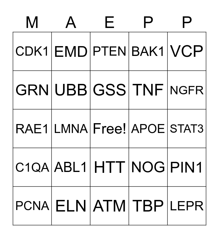 This bingo card has a free space and 24 words: ABL1, ELN, GSS, PCNA, VCP, CDK1, GRN, EMD, APOE, HTT, TNF, RAE1, NOG, PIN1, UBB, TBP, STAT3, PTEN, NGFR, LMNA, LEPR, C1QA, BAK1 and ATM.