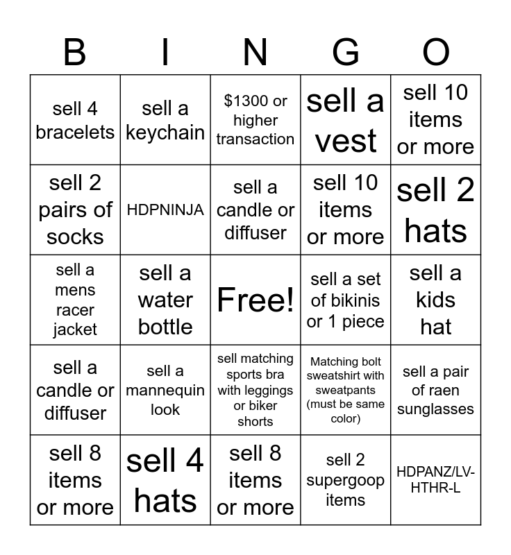 This bingo card has a free space and 24 words: sell a mannequin look, sell 4 hats, sell a candle or diffuser, sell 8 items or more, sell 10 items or more, sell 4 bracelets, sell 2 pairs of socks, sell a keychain, sell a set of bikinis or 1 piece, sell matching sports bra with leggings or biker shorts, sell 10 items or more, sell a mens racer jacket, Matching bolt sweatshirt with sweatpants (must be same color), sell a pair of raen sunglasses, HDPNINJA, sell 2 supergoop items, sell a kids hat, $1300 or higher transaction, sell 2 hats, sell a water bottle, HDPANZ/LV-HTHR-L, sell a candle or diffuser, sell a vest and sell 8 items or more.