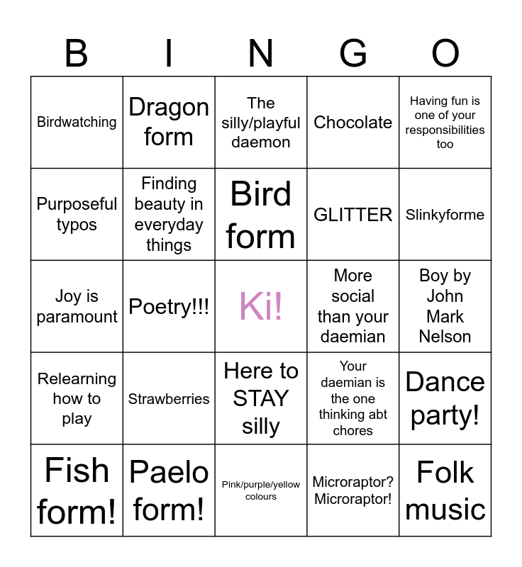 This bingo card has a free space and 24 words: Strawberries, Paelo form!, Bird form, Fish form!, Having fun is one of your responsibilities too, Birdwatching, Purposeful typos, Dragon form, More social than your daemian, Here to STAY silly, GLITTER, Joy is paramount, Your daemian is the one thinking abt chores, Dance party!, Finding beauty in everyday things, Microraptor? Microraptor!, Boy by John Mark Nelson, The silly/playful daemon, Slinkyforme, Poetry!!!, Folk music, Relearning how to play, Chocolate and Pink/purple/yellow colours.