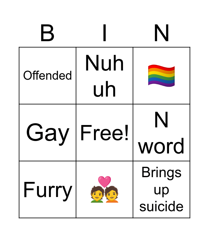 This bingo card has a free space and 8 words: Gay, Nuh uh, N word, Furry, 🏳️🌈, Offended, 💑 and Brings up suicide.
