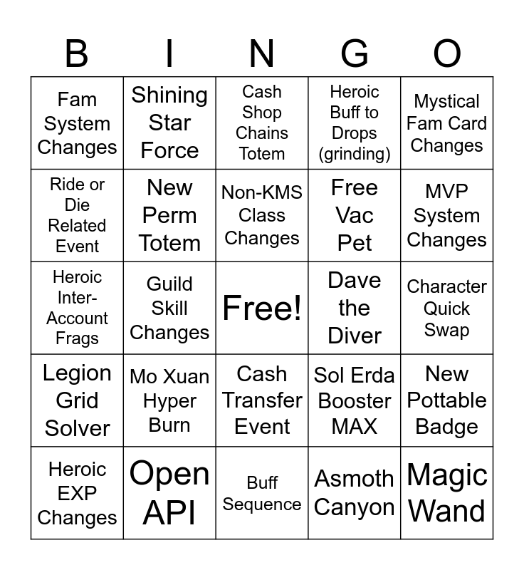 This bingo card has a free space and 24 words: Mo Xuan Hyper Burn, Open API, Non-KMS Class Changes, Heroic EXP Changes, Mystical Fam Card Changes, Fam System Changes, Ride or Die Related Event, Shining Star Force, Dave the Diver, Cash Transfer Event, Free Vac Pet, Heroic Inter-Account Frags, Sol Erda Booster MAX, New Pottable Badge, New Perm Totem, Asmoth Canyon, Character Quick Swap, Cash Shop Chains Totem, MVP System Changes, Guild Skill Changes, Magic Wand, Legion Grid Solver, Heroic Buff to Drops (grinding) and Buff Sequence.