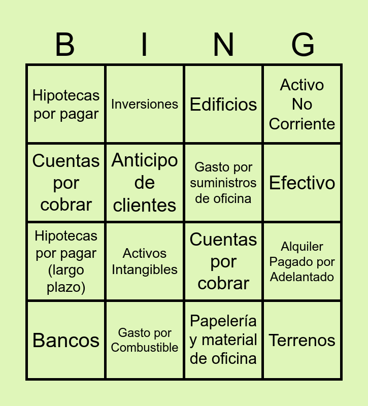 This bingo card has 35 words: Activo, Activo Corriente, Caja chica, Efectivo, Bancos, Inversiones, Cuentas por cobrar, Documentos por cobrar, Cuentas por cobrar, Inventarios de mercadería, Papelería y material de oficina, Activo No Corriente, Propiedad, Planta y Equipo, Mobiliario y equipo de oficina, Edificios, Terrenos, Vehículos, Activos Intangibles, Derechos de autor, Alquiler Pagado por Adelantado, Pasivo, Pasivo Corriente, Cuentas por pagar, Documentos por pagar, Hipotecas por pagar, Anticipo de clientes, Pasivo No Corriente, Documentos por pagar (largo plazo), Hipotecas por pagar (largo plazo), Patrimonio, Capital social, Gasto por Salario, Gasto por Combustible, Gasto por suministros de oficina and Gasto por Depreciación.