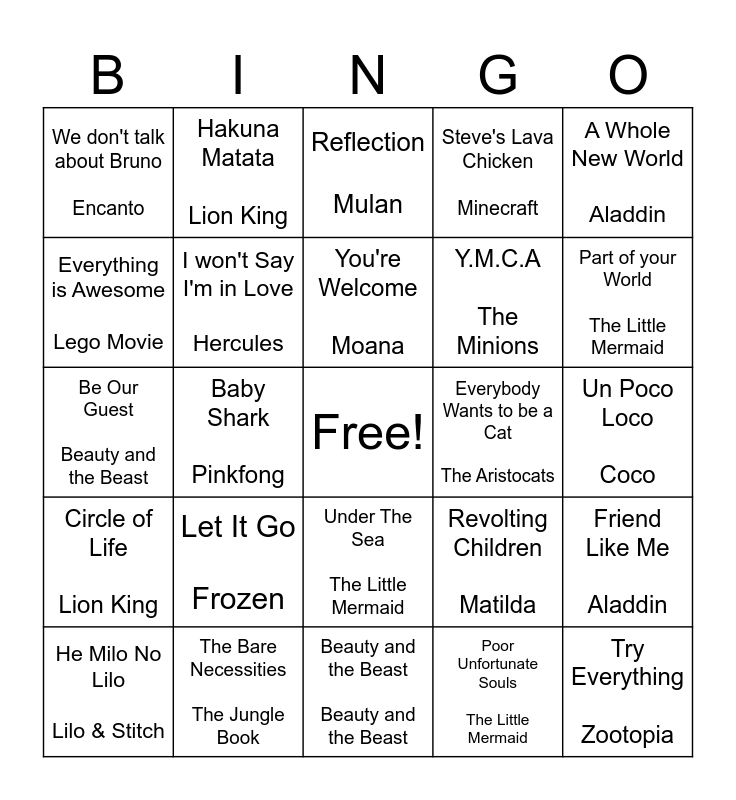 This bingo card has a free space and 29 words: He Milo No Lilo Lilo & Stitch, Bibbidi Bobbidi Boo Cinderella, Baby Shark Pinkfong, Do You Want to Build a Snowman Frozen, We don't talk about Bruno Encanto, Reflection Mulan, I won't Say I'm in Love Hercules, Let It Go Frozen, Everybody Wants to be a Cat The Aristocats, The Bare Necessities The Jungle Book, Un Poco Loco Coco, Try Everything Zootopia, Beauty and the Beast Beauty and the Beast, Poor Unfortunate Souls The Little Mermaid, Part of your World The Little Mermaid, You've got a friend in me Toy Story, Under The Sea The Little Mermaid, Circle of Life Lion King, A Whole New World Aladdin, Be Our Guest Beauty and the Beast, Revolting Children Matilda, The Biggest Burp Matilda, Y.M.C.A The Minions, Everything is Awesome Lego Movie, Steve's Lava Chicken Minecraft, Hakuna Matata Lion King, Friend Like Me Aladdin, You're Welcome Moana and I Like to Move it Madagascar.