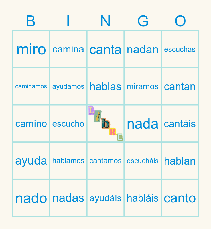 This bingo card has a free space and 42 words: hablo, hablas, habla, hablamos, habláis, hablan, canto, cantas, canta, cantamos, cantáis, cantan, escucho, escuchas, escuchamos, escucháis, escuchan, camino, caminas, camina, caminamos, camináis, caminan, miro, miras, mira, miramos, miráis, miran, ayudo, ayudas, ayuda, ayudamos, ayudáis, ayudan, nado, nadas, nada, nadamos, nadáis, nadan and escucha.