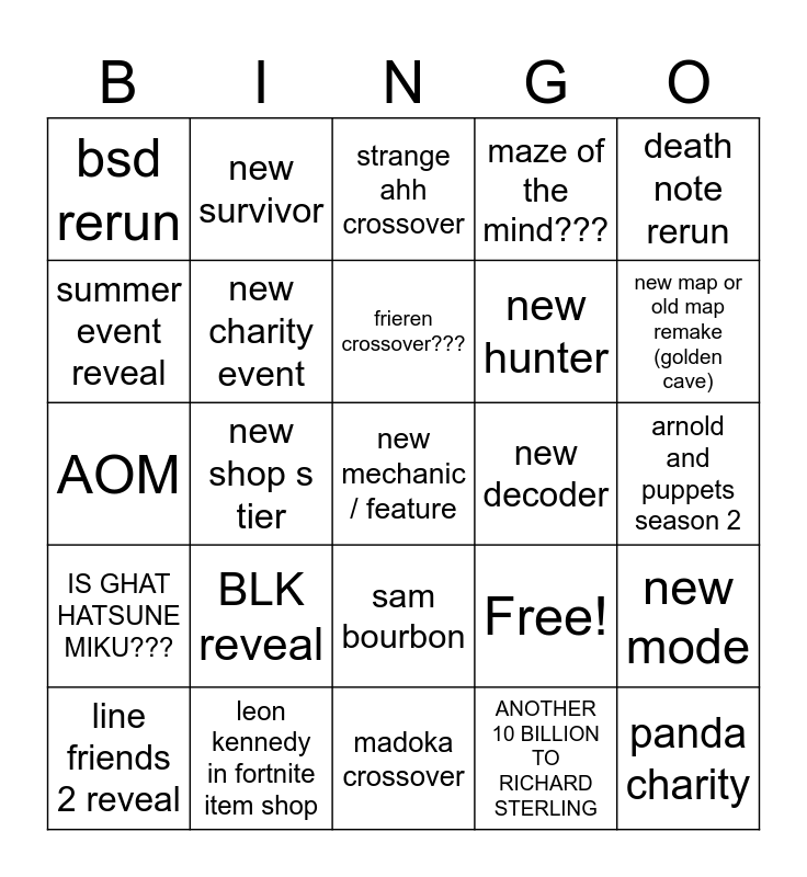 This bingo card has 25 words: BLK reveal, madoka crossover, frieren crossover???, line friends 2 reveal, death note rerun, bsd rerun, summer event reveal, new survivor, new decoder, sam bourbon, new hunter, AOM, Free!, new mode, new charity event, panda charity, arnold and puppets season 2, strange ahh crossover, new map or old map remake (golden cave), new shop s tier, new mechanic / feature, leon kennedy in fortnite item shop, IS GHAT HATSUNE MIKU???, maze of the mind??? and ANOTHER 10 BILLION TO RICHARD STERLING.