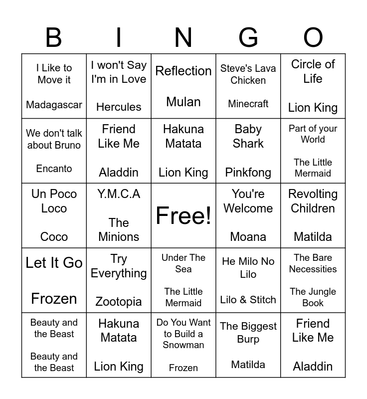 This bingo card has a free space and 27 words: He Milo No Lilo Lilo & Stitch, Bibbidi Bobbidi Boo Cinderella, Baby Shark Pinkfong, Do You Want to Build a Snowman Frozen, We don't talk about Bruno Encanto, Reflection Mulan, I won't Say I'm in Love Hercules, Let It Go Frozen, You're Welcome Moana, The Bare Necessities The Jungle Book, Un Poco Loco Coco, Steve's Lava Chicken Minecraft, Beauty and the Beast Beauty and the Beast, Hakuna Matata Lion King, Part of your World The Little Mermaid, You've got a friend in me Toy Story, Friend Like Me Aladdin, Hakuna Matata Lion King, Try Everything Zootopia, I Like to Move it Madagascar, Revolting Children Matilda, The Biggest Burp Matilda, Y.M.C.A The Minions, Friend Like Me Aladdin, Under The Sea The Little Mermaid, Circle of Life Lion King and A Whole New World Aladdin.