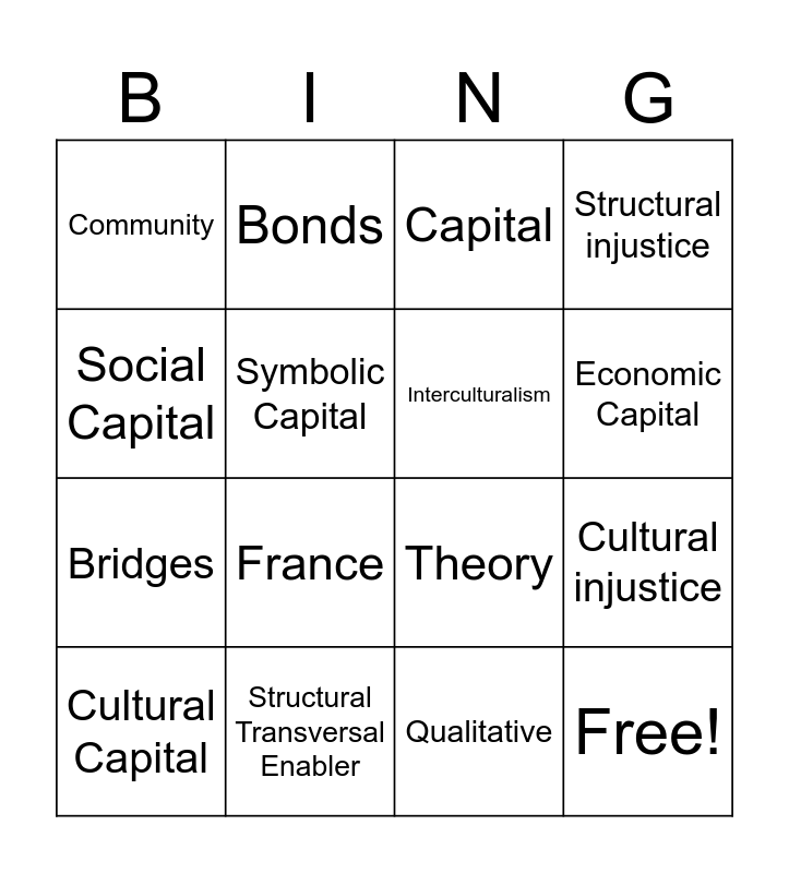 This bingo card has 23 words: Free!, Bourdieu, Economic Capital, Social connectedness, Social Capital, Community, Symbolic Capital, Bonds, Cultural Capital, Multiculturalism, France, Bridges, Linkages, Place, Structural Transversal Enabler, Everyday Transversal Enabler, Capital, Theory, Interculturalism, Cultural injustice, Structural injustice, Qualitative and Empathetic analysis.