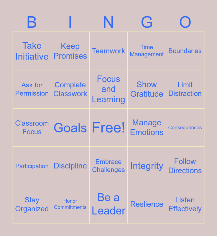 This bingo card has a free space and 38 words: Cooperation, Authority, Respect, Consequences, Participation, Discipline, Focus and Learning, Technology is a Tool, Limit Distraction, Ask for Permission, Complete Classwork, Time Management, Listen Effectively, Classroom Focus, Keep Promises, Be a Leader, Self-Control, Boundaries, Build Good Habits, Goals, Teamwork, Integrity, Follow Directions, Stay Organized, Patience, Effort Matters, Reslience, Respect Others Space, Plan Ahead, Be Prepared, Stay Posiitve, Manage Emotions, Work Ethic, Take Initiative, Honor Committments, Embrace Challenges, Show Gratitude and Seek Solutions.