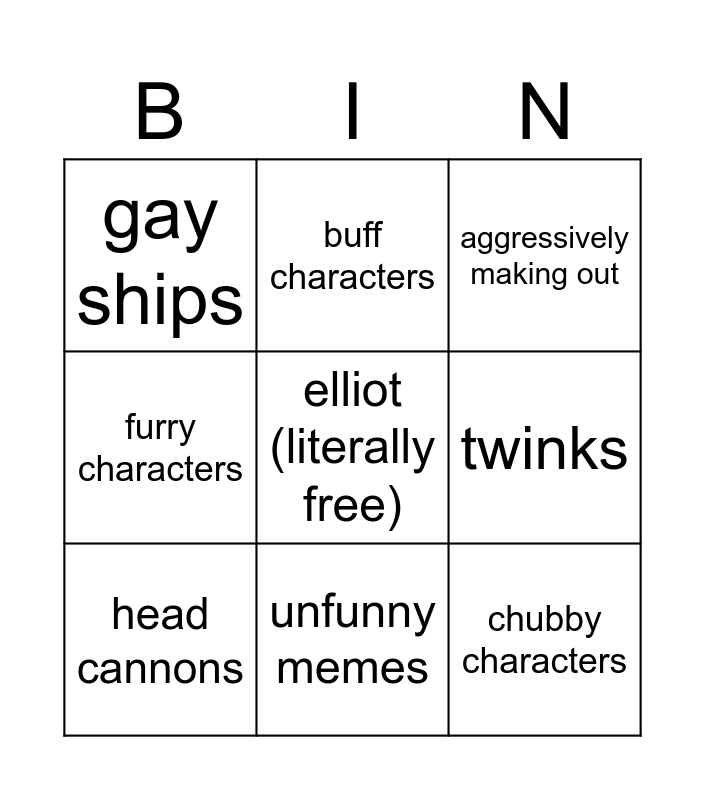 This bingo card has a free space and 8 words: twinks, aggressively making out, buff characters, head cannons, gay ships, chubby characters, furry characters and unfunny memes.