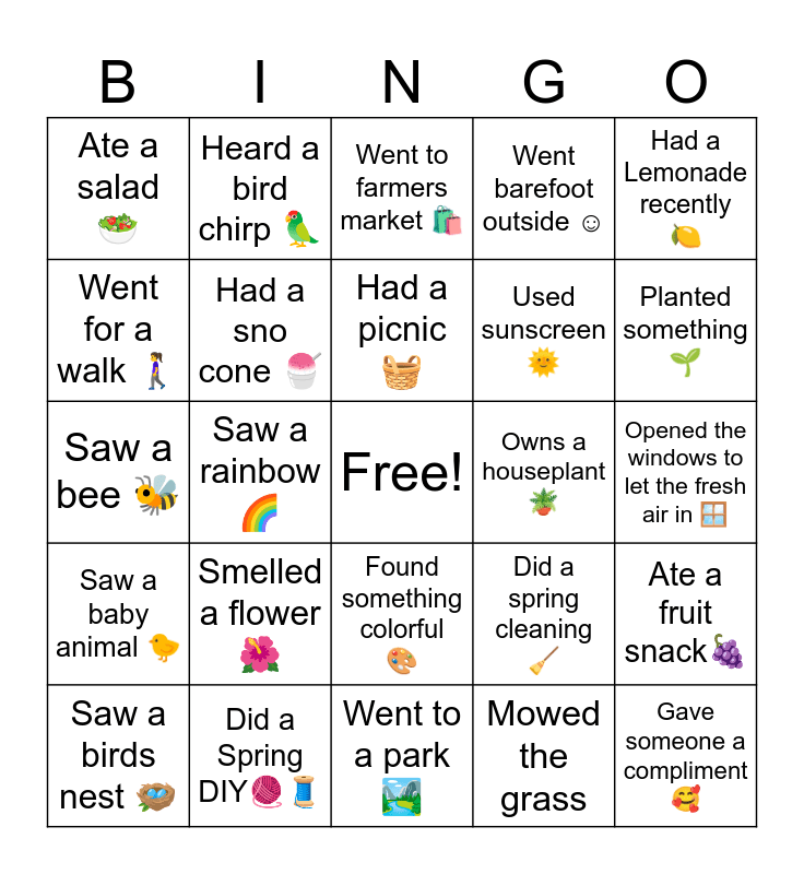 This bingo card has a free space and 24 words: Smelled a flower 🌺, Did a Spring DIY🧶🧵, Had a picnic 🧺, Saw a birds nest 🪺, Had a Lemonade recently 🍋, Ate a salad 🥗, Went for a walk 🚶♀️, Heard a bird chirp 🦜, Owns a houseplant🪴, Found something colorful 🎨, Used sunscreen 🌞, Saw a bee 🐝, Did a spring cleaning 🧹, Ate a fruit snack🍇, Had a sno cone 🍧, Mowed the grass, Opened the windows to let the fresh air in 🪟, Went to farmers market 🛍️, Planted something 🌱, Saw a rainbow 🌈, Gave someone a compliment 🥰, Saw a baby animal 🐤, Went barefoot outside ☺️ and Went to a park🏞️.
