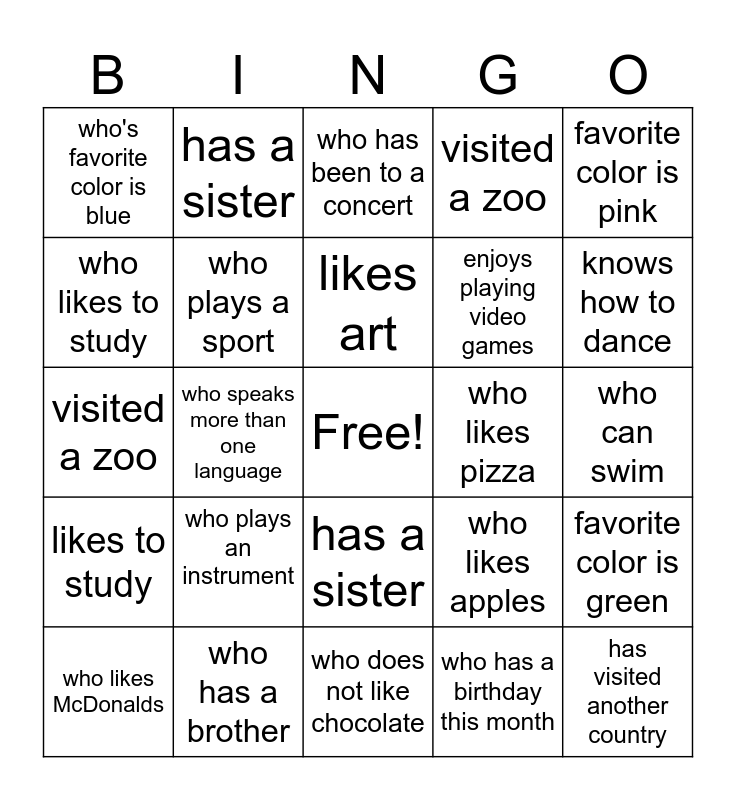 This bingo card has a free space and 29 words: who likes McDonalds, who likes to watch romance movies, who speaks more than one language, who has a pet, who's favorite color is blue, who has been to a concert, who plays a sport, who plays an instrument, who likes pizza, who has a brother, who can swim, has visited another country, who does not like chocolate, who has a birthday this month, knows how to dance, enjoys playing video games, has a sister, likes to study, favorite color is pink, visited a zoo, who likes apples, is a bad singer, enjoys playing video games, who likes to study, visited a zoo, has a sister, favorite color is green, likes art and who likes MosBurger.