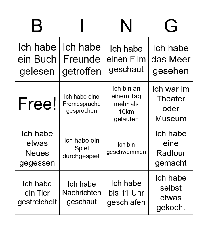 This bingo card has 16 words: Ich habe Nachrichten geschaut, Ich habe eine Radtour gemacht, Ich habe einen Film geschaut, Ich habe ein Buch gelesen, Ich habe etwas Neues gegessen, Ich habe Freunde getroffen, Ich bin geschwommen, Ich habe bis 11 Uhr geschlafen, Free!, Ich habe eine Fremdsprache gesprochen, Ich habe ein Tier gestreichelt, Ich habe das Meer gesehen, Ich habe ein Spiel durchgespielt, Ich war im Theater oder Museum, Ich bin an einem Tag mehr als 10km gelaufen and Ich habe selbst etwas gekocht.