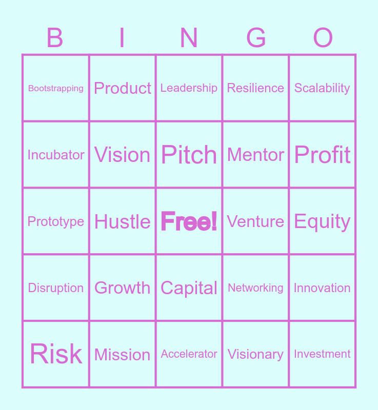 This bingo card has a free space and 39 words: Startup, Founder, Innovation, Vision, Risk, Capital, Pitch, Branding, Scalability, Disruption, Hustle, Resilience, Investment, Equity, Venture, Growth, Pivot, Bootstrapping, Strategy, Networking, Incubator, Accelerator, Mentor, Profit, Loss, Revenue, Marketing, Sales, Customer, Product, Service, Team, Leadership, Mission, Visionary, Execution, Innovation, Prototype and MVP.