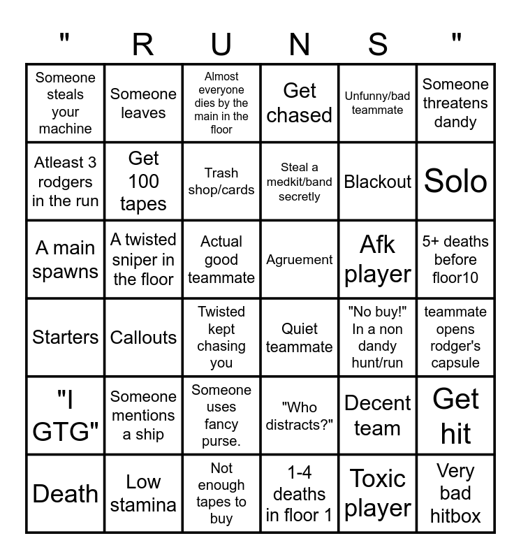 This bingo card has 36 words: "Who distracts?", Someone uses fancy purse., 1-4 deaths in floor 1, Atleast 3 rodgers in the run, Starters, Agruement, Get 100 tapes, Not enough tapes to buy, Unfunny/bad teammate, Decent team, Solo, Get chased, Get hit, A twisted sniper in the floor, Steal a medkit/band secretly, Someone steals your machine, "I GTG", Afk player, A main spawns, Almost everyone dies by the main in the floor, Actual good teammate, Callouts, Quiet teammate, Twisted kept chasing you, "No buy!" In a non dandy hunt/run, Someone leaves, Blackout, Low stamina, Trash shop/cards, Someone threatens dandy, Very bad hitbox, Death, teammate opens rodger's capsule, 5+ deaths before floor10, Someone mentions a ship and Toxic player.