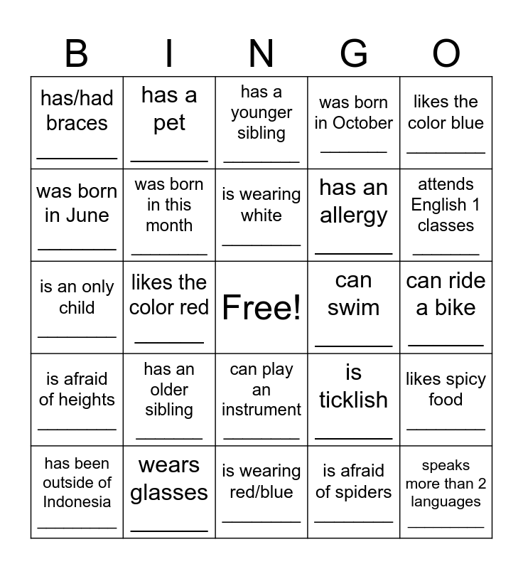 This bingo card has a free space and 24 words: has an older sibling _______, wears glasses ______, is wearing white ________, has been outside of Indonesia _________, likes the color blue ________, has/had braces _______, was born in June _______, has a pet ______, can swim ______, can play an instrument ________, has an allergy ______, is an only child ________, is ticklish ______, likes spicy food ________, was born in this month ________, is afraid of spiders ________, can ride a bike ______, has a younger sibling ________, attends English 1 classes _______, likes the color red ______, speaks more than 2 languages _________, is afraid of heights ________, was born in October _______ and is wearing red/blue ________.