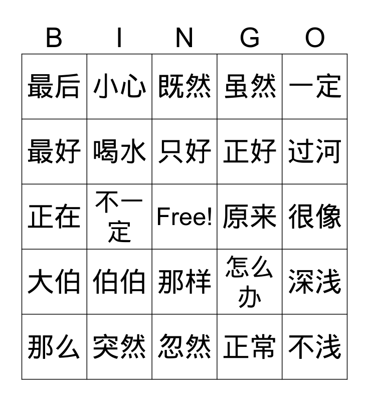 This bingo card has a free space and 24 words: 伯伯, 突然, 只好, 那么, 一定, 最后, 最好, 小心, 原来, 那样, 正好, 正在, 怎么办, 深浅, 喝水, 正常, 很像, 既然, 过河, 不一定, 不浅, 大伯, 虽然 and 忽然.