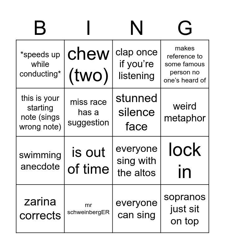 This bingo card has 16 words: mr schweinbergER, lock in, clap once if you’re listening, *speeds up while conducting*, swimming anecdote, chew (two), everyone sing with the altos, everyone can sing, this is your starting note (sings wrong note), miss race has a suggestion, zarina corrects, makes reference to some famous person no one’s heard of, is out of time, weird metaphor, stunned silence face and sopranos just sit on top.