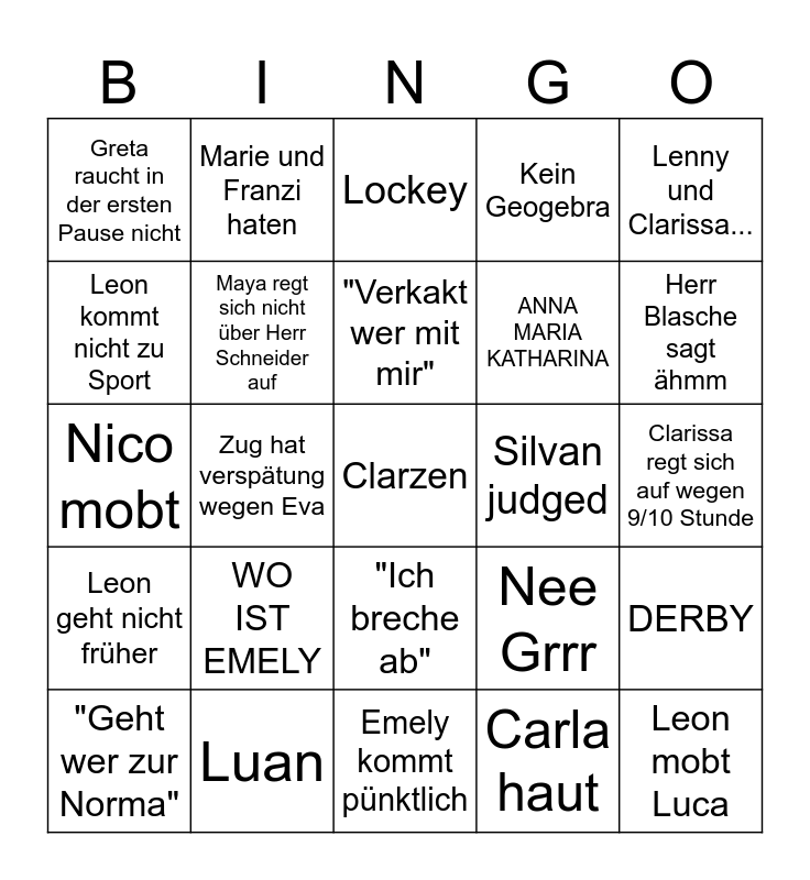 This bingo card has a free space and 24 words: WO IST EMELY, Luan, "Verkakt wer mit mir", "Geht wer zur Norma", Lenny und Clarissa..., Greta raucht in der ersten Pause nicht, Leon kommt nicht zu Sport, Marie und Franzi haten, Silvan judged, "Ich breche ab", ANNA MARIA KATHARINA, Nico mobt, Nee Grrr, DERBY, Maya regt sich nicht über Herr Schneider auf, Carla haut, Clarissa regt sich auf wegen 9/10 Stunde, Lockey, Herr Blasche sagt ähmm, Zug hat verspätung wegen Eva, Leon mobt Luca, Leon geht nicht früher, Kein Geogebra and Emely kommt pünktlich.