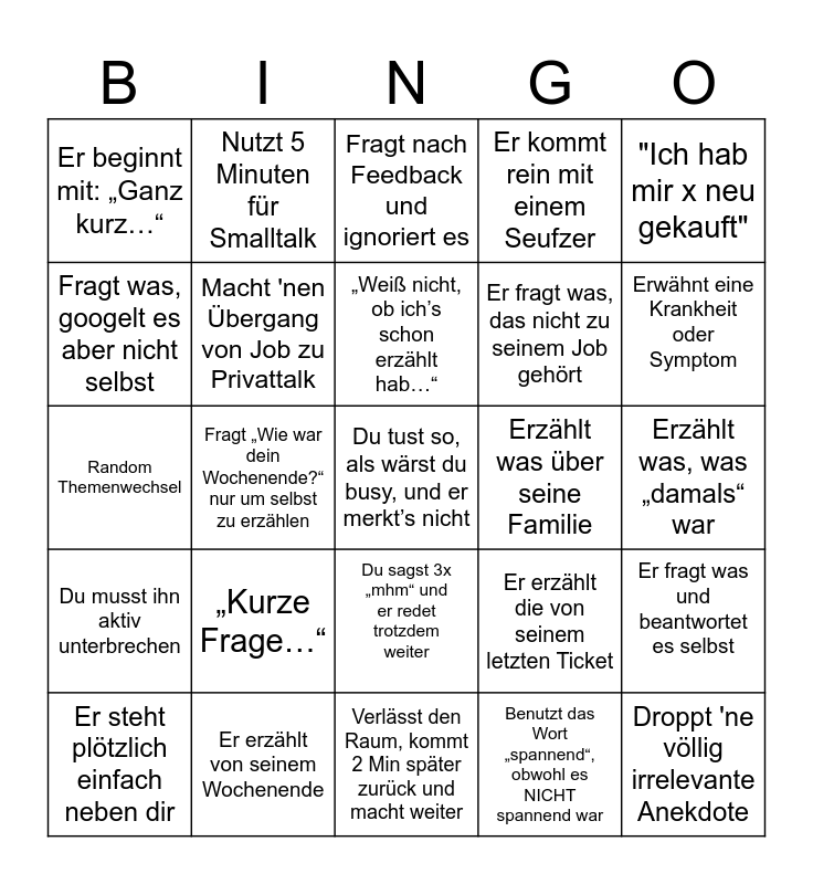 This bingo card has a free space and 24 words: „Kurze Frage…“, Er erzählt von seinem Wochenende, „Weiß nicht, ob ich’s schon erzählt hab…“, Er steht plötzlich einfach neben dir, "Ich hab mir x neu gekauft", Er beginnt mit: „Ganz kurz…“, Fragt was, googelt es aber nicht selbst, Nutzt 5 Minuten für Smalltalk, Erzählt was über seine Familie, Du sagst 3x „mhm“ und er redet trotzdem weiter, Er fragt was, das nicht zu seinem Job gehört, Random Themenwechsel, Er erzählt die von seinem letzten Ticket, Er fragt was und beantwortet es selbst, Macht 'nen Übergang von Job zu Privattalk, Benutzt das Wort „spannend“, obwohl es NICHT spannend war, Erzählt was, was „damals“ war, Fragt nach Feedback und ignoriert es, Erwähnt eine Krankheit oder Symptom, Fragt „Wie war dein Wochenende?“ nur um selbst zu erzählen, Droppt 'ne völlig irrelevante Anekdote, Du musst ihn aktiv unterbrechen, Er kommt rein mit einem Seufzer and Verlässt den Raum, kommt 2 Min später zurück und macht weiter.
