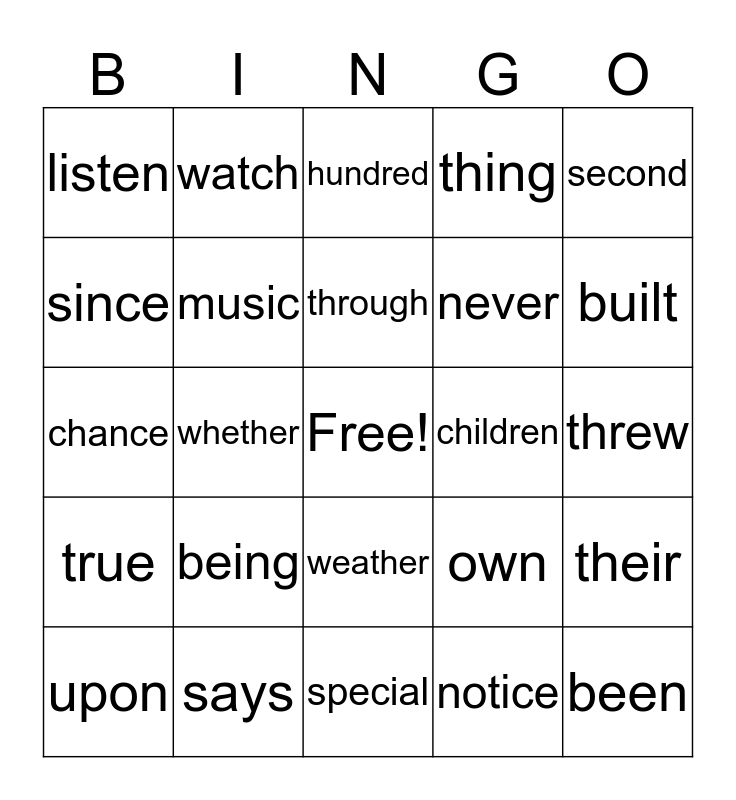 This bingo card has a free space and 30 words: says, myself, whether, until, listen, hundred, music, weather, children, special, threw, been, notice, products, built, think, own, true, being, second, chance, center, watch, never, since, thing, their, upon, through and bring.