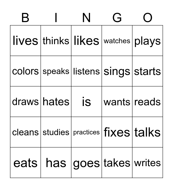 This bingo card has a free space and 29 words: eats, drinks, hates, loves, lives, likes, speaks, studies, wants, has, reads, writes, goes, takes, starts, finishes, practices, cleans, plays, draws, fixes, understands, sings, colors, watches, thinks, talks, listens and prefers.