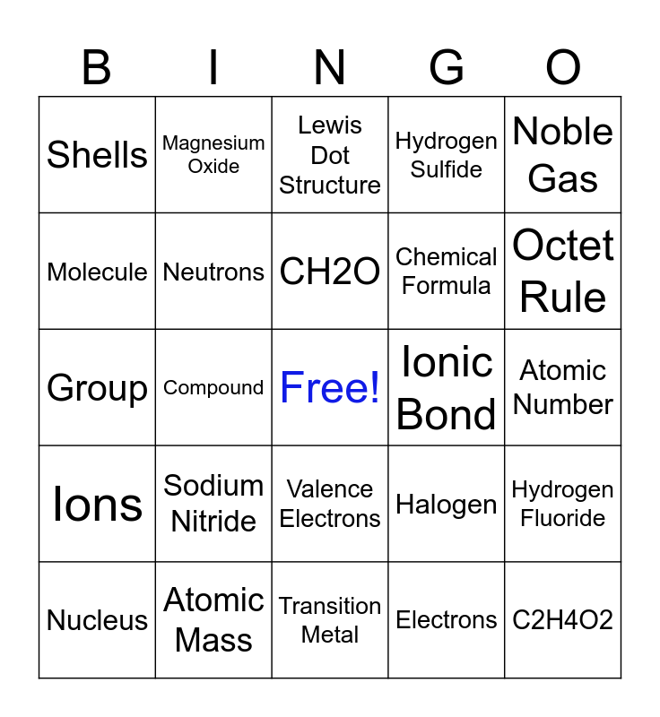 This bingo card has a free space and 29 words: Nucleus, C3H8, Compound, Protons, Shells, Lewis Dot Structure, Neutrons, Sodium Nitride, Ionic Bond, Atomic Mass, Atomic Number, C2H4O2, Transition Metal, Electrons, Octet Rule, Periodic Table, Valence Electrons, Ions, Noble Gas, Group, Halogen, Covalent Bond, Chemical Formula, Molecule, Hydrogen Sulfide, Magnesium Oxide, Hydrogen Fluoride, CH2O and C2H6O.