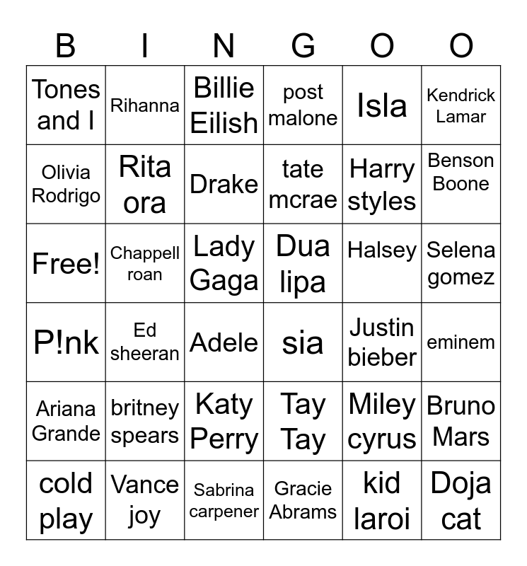 This bingo card has 36 words: Tay Tay, Katy Perry, Gracie Abrams, Olivia Rodrigo, P!nk, Dua lipa, Rita ora, Sabrina carpener, Isla, Miley cyrus, Benson Boone, post malone, Bruno Mars, Chappell roan, tate mcrae, Tones and I, Ariana Grande, Halsey, Free!, Billie Eilish, Lady Gaga, Ed sheeran, sia, Adele, Justin bieber, Rihanna, Harry styles, Vance joy, Drake, Kendrick Lamar, Doja cat, cold play, eminem, Selena gomez, britney spears and kid laroi.