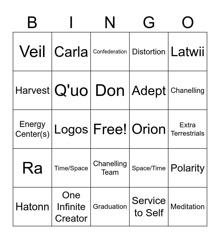 This bingo card has a free space and 34 words: Law of One, Service to Self, Service to Others, Social Memory Complex, Ra, Q'uo, Latwii, Hatonn, Carla, Jim, Don, Confederation, 3rd Density, 4th Density, Orion, Chanelling, One Infinite Creator, Energy Center(s), Time/Space, Space/Time, Chanelling Team, Archetype(s), Veil, Extra Terrestrials, Graduation, Meditation, Distortion, Catalyst, Adept, Harvest, Free Will, Logos, Polarity and Choice.