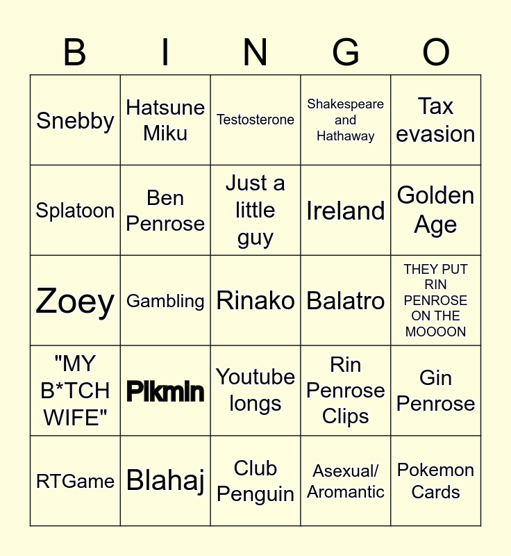 This bingo card has a free space and 24 words: Pikmin, Blahaj, Just a little guy, RTGame, Tax evasion, Snebby, Splatoon, Hatsune Miku, Balatro, Youtube longs, Ireland, Zoey, Rin Penrose Clips, Gin Penrose, Ben Penrose, Asexual/ Aromantic, THEY PUT RIN PENROSE ON THE MOOOON, Testosterone, Golden Age, Gambling, Pokemon Cards, "MY B*TCH WIFE", Shakespeare and Hathaway and Club Penguin.