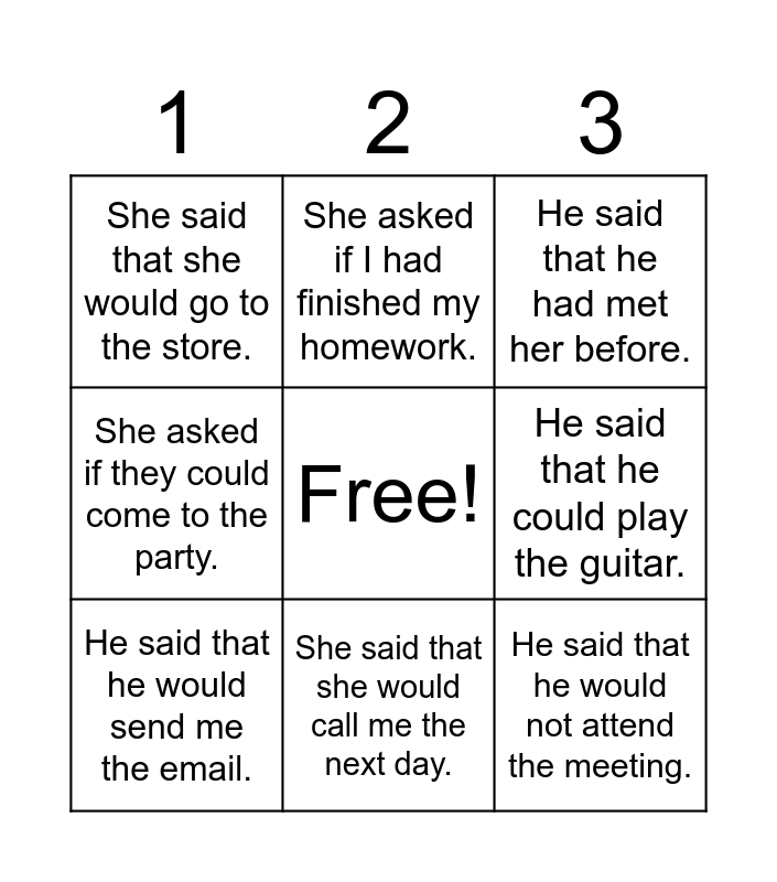 This bingo card has a free space and 12 words: He asked if I would help him with that project., Anna said that she could swim., He said that he would not attend the meeting., He said that he could play the guitar., She asked if I had finished my homework., He said that he had met her before., She said that she would call me the next day., She said that she would not do that., She said that she would go to the store., She asked if they could come to the party., He said that he would send me the email. and Emma said that she had written a poem..