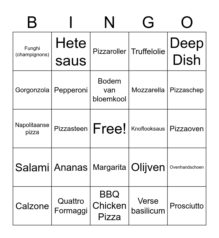This bingo card has a free space and 25 words: Ananas, BBQ Chicken Pizza, Bodem van bloemkool, Calzone, Deep Dish, Funghi (champignons), Gorgonzola, Hete saus, Knoflooksaus, Margarita, Mozzarella, Napolitaanse pizza, Olijven, Ovenhandschoen, Pepperoni, Pizzabodem, Pizzaoven, Pizzaroller, Pizzaschep, Pizzasteen, Prosciutto, Quattro Formaggi, Salami, Truffelolie and Verse basilicum.