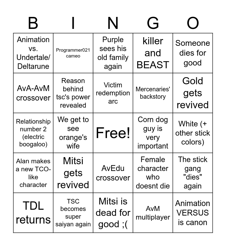 This bingo card has a free space and 24 words: Mitsi gets revived, TSC becomes super saiyan again, Victim redemption arc, TDL returns, Someone dies for good, Animation vs. Undertale/ Deltarune, AvA-AvM crossover, Programmer021 cameo, Corn dog guy is very important, AvEdu crossover, Mercenaries' backstory, Relationship number 2 (electric boogaloo), Female character who doesnt die, The stick gang "dies" again, Reason behind tsc's power revealed, AvM multiplayer, White (+ other stick colors), Purple sees his old family again, Gold gets revived, We get to see orange's wife, Animation VERSUS is canon, Alan makes a new TCO-like character, killer and BEAST and Mitsi is dead for good ;(.