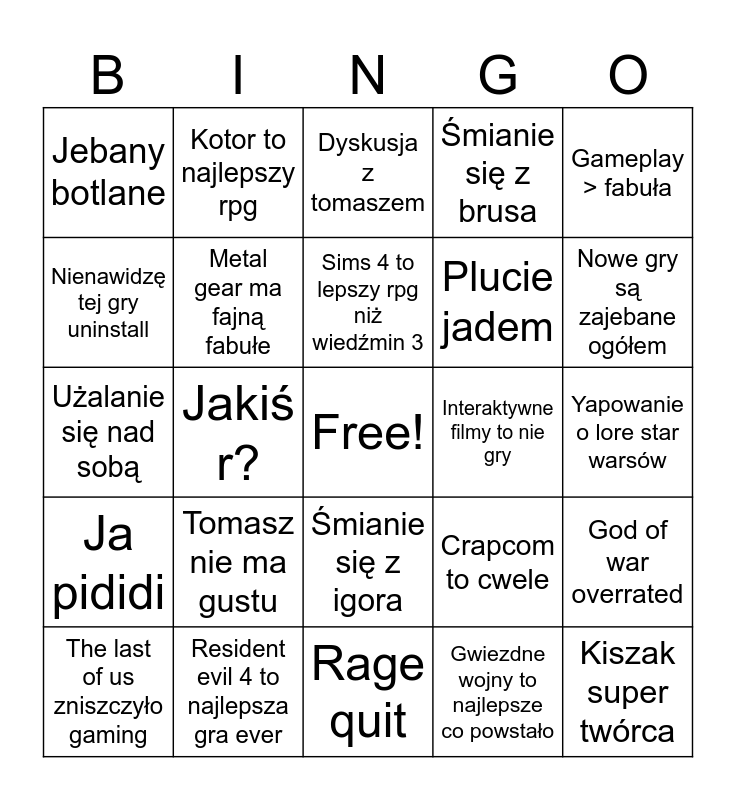 This bingo card has a free space and 24 words: Tomasz nie ma gustu, Resident evil 4 to najlepsza gra ever, Sims 4 to lepszy rpg niż wiedźmin 3, The last of us zniszczyło gaming, Gameplay > fabuła, Jebany botlane, Nienawidzę tej gry uninstall, Kotor to najlepszy rpg, Interaktywne filmy to nie gry, Śmianie się z igora, Plucie jadem, Użalanie się nad sobą, Crapcom to cwele, God of war overrated, Metal gear ma fajną fabułe, Gwiezdne wojny to najlepsze co powstało, Yapowanie o lore star warsów, Dyskusja z tomaszem, Nowe gry są zajebane ogółem, Jakiś r?, Kiszak super twórca, Ja pididi, Śmianie się z brusa and Rage quit.
