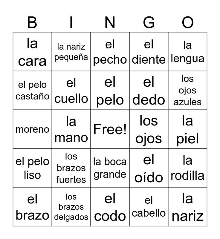 This bingo card has a free space and 55 words: la boca, el brazo, la cabeza, la cara, el codo, el corazón, el cuello, el cuerpo, el dedo, el dedo del pie, el diente, la espalda, el estómago, la garganta, el hombro, el labio, la lengua, la mano, la muela, la nariz, los ojos, la oreja, el oído, el pecho, el pie, el pelo, el cabello, la pierna, la piel, la rodilla, las mejillas, el pelo rubio, el pelo corto, el pelo negro, el pelo castaño, moreno, el pelo largo, el pelo liso, el pelo rizado, la nariz grande, la nariz pequeña, la cara bonita, la cara, los brazos largos, los brazos fuertes, los brazos delgados, las piernas largas, los ojos negros, los ojos verdes, los ojos azules, los ojos de color café, los pies grandes, los pies pequeños, la boca grande and la boca pequeña.