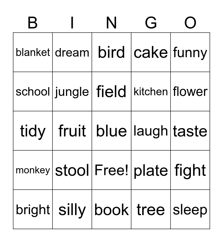 This bingo card has 26 words: Free!, tree, field, silly, funny, blanket, school, dream, taste, plate, kitchen, tidy, fight, bright, fruit, room, cake, monkey, bird, blue, flower, book, laugh, stool, jungle and sleep.