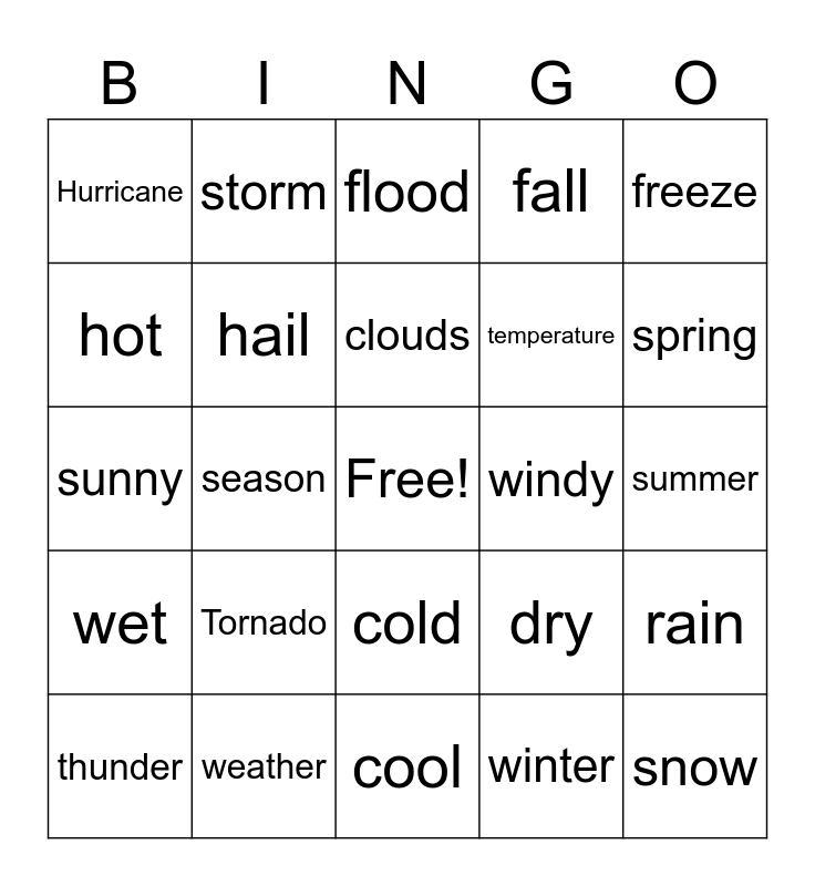 This bingo card has a free space and 24 words: Tornado, weather, clouds, thunder, freeze, Hurricane, hot, storm, windy, cold, temperature, sunny, dry, rain, hail, winter, summer, flood, spring, season, snow, wet, fall and cool.