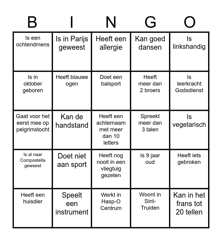 This bingo card has a free space and 24 words: Doet niet aan sport, Speelt een instrument, Doet een balsport, Heeft een huisdier, Is linkshandig, Is een ochtendmens, Is in oktober geboren, Is in Parijs geweest, Spreekt meer dan 3 talen, Heeft nog nooit in een vliegtuig gezeten, Heeft meer dan 2 broers, Gaat voor het eerst mee op pelgrimstocht, Is 9 jaar oud, Heeft iets gebroken, Heeft blauwe ogen, Woont in Sint-Truiden, Is vegetarisch, Heeft een allergie, Is leerkracht Godsdienst, Kan de handstand, Kan in het frans tot 20 tellen, Is al naar Compostella geweest, Kan goed dansen and Werkt in Hasp-O Centrum.